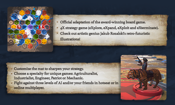 - Engine Building: Players can improve their construction abilities to become more efficient, build structures that improve their position on the map, enlist new recruits into their faction, activate mechs to dissuade opponents from invading and expand their borders to reap greater types and quantities of resources. This aspect creates a feeling of energy and progression over the course of the entire game. The order in which players get to develop their economy and technologies adds to the unique feel of every game, even when playing as the same faction several times.